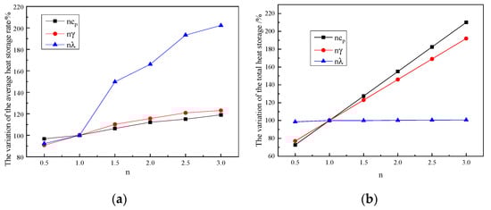 Specific heat, latent heat, and thermal conductivity of the PCM on its thermal storage performance ((a) the variation of the average thermal storage rate; (b) the variation of the total heat storage).