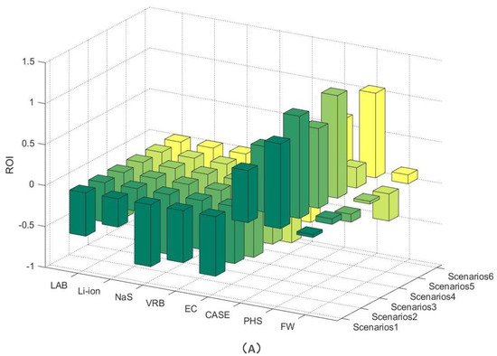 Figure 5A,B present the measurements of unit cost-effectiveness and return on investment for each type of energy storage device, based on the present value of the total cost and the present value of the total benefit under each scenario.