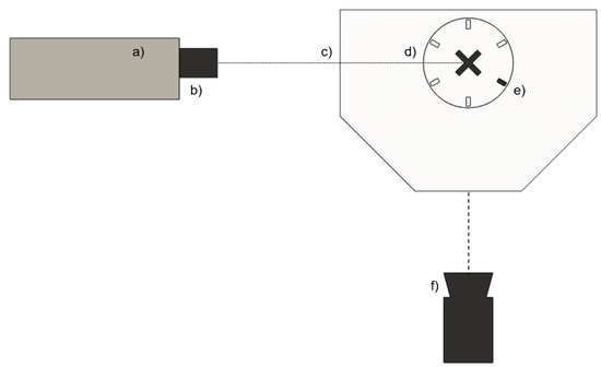 LIF setup, top view. (a) CW laser. (b) Light sheet optics. (c) Polyhedral aquarium. (d) Vessel with stirrers and internals. (e) 3D-printed injection baffle. (f) CCD camera. The dotted line represents the position of the laser light sheet.