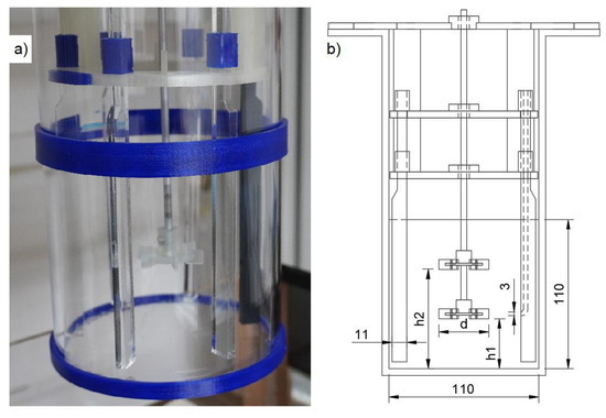 For the second set of experiments, impeller combinations of either two Rushton turbines or two pitched blade turbines were installed. In these cases, it is known that the impeller installation heights and the distance between individual stages provide a significant impact on the resulting flow conditions [20,33,34,35,36,37,38,39].