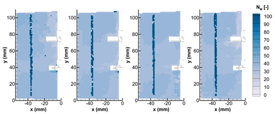 For measurements, the tank is filled with tap water to a level of 110 mm (therefore H/D = 1). The impeller and internals are positioned and the stirrer motor is activated at the respective rotational frequency. In contrast to PIV measurements, the usage of a refractive index matching (RIM) fluid [21,23] is not suitable for mixing experiments, because the fluid has to be replaced after every measurement. As a consequence, the inserted baffles are visible within the acquired images. With the previous calibration, however, the evaluation is feasible with only minor measurement errors in the baffle region, due to one baffle edge being visible in the acquired images. This must be taken into account when interpreting the following figures, where the baffle is observable by a slight vertical stripe in a negligibly small area of the figures.