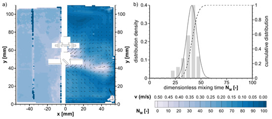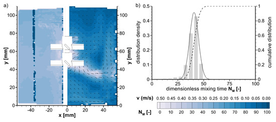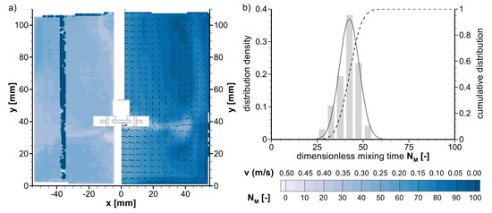 The MTD plot for the Rushton turbine on the left of Figure 5a reveals a comparatively uniform mixing time distribution, with the lowest values found directly in the region of the radial impeller discharge stream. On the one hand, this observation fits well with the theory and, on the other hand, also very well with the flow field, which can be seen on the right of Figure 5a. Between the two ring vortices, the radial discharge stream forms the zone with the greatest flow velocity and turbulence. The shortest mixing time can also be observed in this region, which indicates intensive mixing in the main radial discharge flow. The dimensions of the two vortices, described and derived by the main flow vectors, are around (0.75–0.9) d, with the lower ring vortex, limited by the vessel walls, appearing somewhat smaller than the upper one. At the bottom of the vessel, in the vicinity of the walls, below the level line and in the core of the ring vortices, slightly longer mixing times can be seen, in line with the lower flow velocity there. Nevertheless, the mixing time distribution displayed in Figure 5b shows a satisfactory similarity and therefore a quite uniform distribution over the entire volume, resulting in a mean value µ = 42.5 for the dimensionless mixing time with a corresponding standard deviation of 5.4. In Distelhoff et al.’s study [15], a value of 37.1 can be found for this system, which is slightly lower, but in the same order of magnitude as these results. This deviation can be explained by the higher impeller Reynolds number of 24,000 used during their measurements.