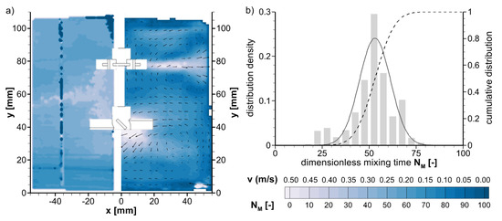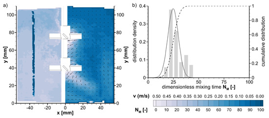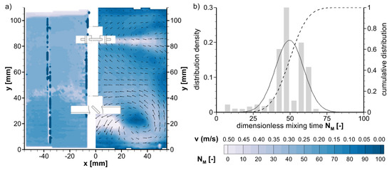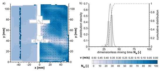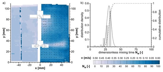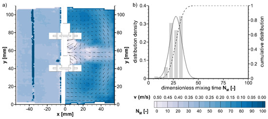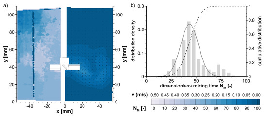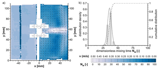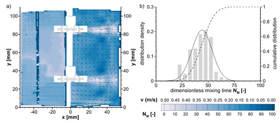 With the turbines positioned at the standard installation heights (h1/D = 1/3, h2/D = 2/3; see Figure 8a) or even closer toward each other (h1/D = 5/12, h2/D = 7/12; see Figure 9a), the “merging flow” pattern [35] is formed, a singular intensive radial flow field that encompasses the entirety of the volume, as can be seen on the right side of the figures. The respective MTD plots on the left side of the figure shows shorter mixing times everywhere in the volume, with a more uniform distribution. However, low values in the combined main discharge flow, in the middle between the two stirrer stages, in particular once again indicate the influence of turbulence and not only absolute flow velocity on mixing times. From Figure 7b and Figure 8b, it can be derived that both configurations with the smaller stage distance deliver lower mean dimensionless mixing times with µ = 27.5 and µ = 35.9, respectively. At σ = 5.8 and σ = 3.2, the standard deviation is lower or in the same order of magnitude as for the single stage (cf. Figure 5), but significantly lower than for the two-stage version with a large distance (cf. Figure 7). These results are in line with Rutherford et al. [35], who also found lower mixing times with the standard setup and the “merging flow” pattern, compared to the increased distance and the “parallel flow”. The observed difference of about 38% found in this study is slightly higher than the 20% from the literature, which can again be explained by the different investigated Reynolds numbers.
