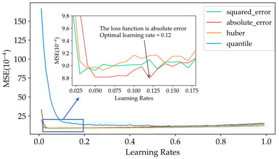 The GBDT model’s loss function and learning rate serve as hyperparameters during the training process. With an increase in the learning rate, the model undergoes phases of under-fitting, optimal fitting, and over-fitting, causing the MSE to decrease and subsequently increase after reaching its minimum. Hence, selecting the appropriate learning rate and loss function is crucial, as depicted in Figure 3. The corresponding MSE for different learning rates and loss functions is presented in the figure. Notably, when the loss function is the absolute error and the learning rate (denoted as ) is set to 0.12, the MSE reaches its minimum, signifying the optimal performance of the GBDT voltage prediction model.