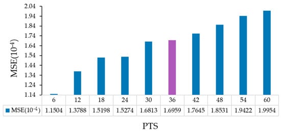 To achieve timely and accurate prediction of power battery anomalies, two factors need to be considered. On the one hand, to maximize the accuracy of voltage prediction, provide more precise data for voltage anomaly diagnosis, thereby enhancing the accuracy of safety warnings. On the other hand, while ensuring the accuracy of predictions, the PTS of GBDT should be as long as possible. This gives the driver more time to respond to impending anomalies. Therefore, this paper conducted MSE comparative experiments with different PTSs. The experiments included 10 different PTSs, denoted as PTS = 6, 12, 18, 24, 30, 36, 42, 48, 54, and 60, corresponding to predicting battery voltage for the next 1, 2, 3, 4, 5, 6, 7, 8, 9, and 10 min, respectively. As shown in Figure 5, when PTS is too long, it results in a larger MSE, making precise battery voltage prediction unattainable. Conversely, when PTS is too short, timely alarms cannot be achieved. Considering both factors, this paper selects PTS = 36, where the MSE is 1.6959 × 10−4.