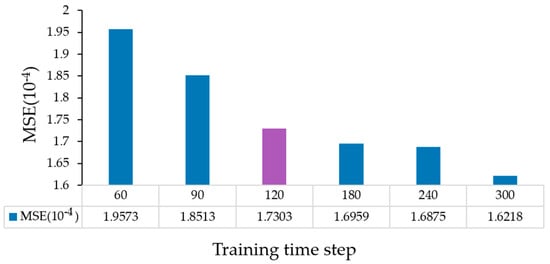 The initially set hyperparameters of the model indicate that the initial training time step is configured as 180, representing half-hourly battery voltage data. For the sake of prediction accuracy and timeliness, a further comparison of MSE is conducted with time steps set at 60, 90, 120, 180, 240, and 300. This implies inputting historical data of 10, 15, 20, 30, 40, and 50 min into the modified GBDT model, respectively. The MSE results are depicted in Figure 6. When time steps are set to 60 and 90, the model’s predicted mean squared error (MSE) is relatively high, indicating lower accuracy in voltage prediction. As the time steps increase to 120, there is a noticeable decrease in MSE, signifying improved accuracy in voltage prediction. Beyond 120 time steps, the change in MSE becomes less pronounced. However, with an increase in time steps, the model training time also increases, leading to a decrease in timeliness. In summary, setting time steps to 120 achieves a balance between accuracy in voltage prediction and meeting timeliness requirements.