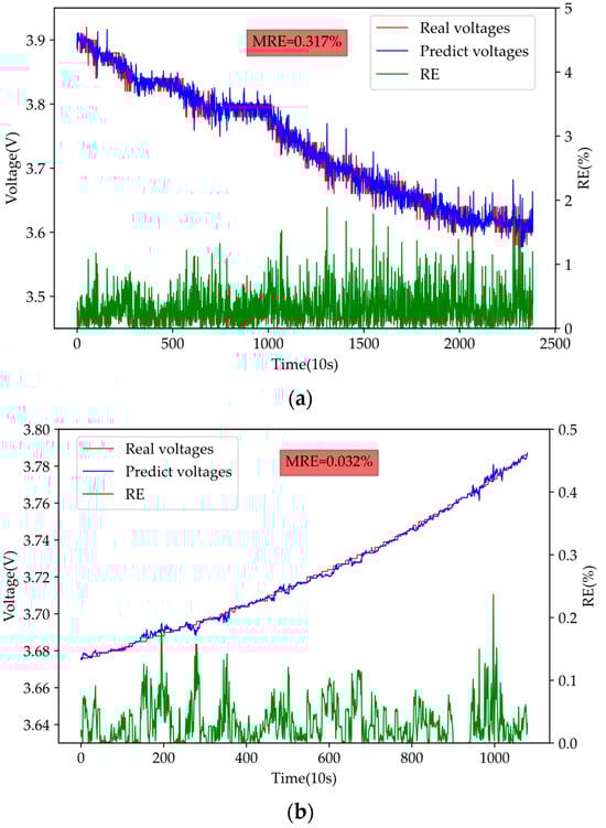 Voltage prediction results in different states of the verification set. (a) Driving state; (b) charging state.