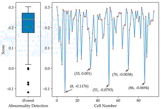 Predicted voltages from Section 5.1 are input into the isolated forest, yielding the average search path length for each battery cell. This length, considered the score, is subsequently analyzed using a box plot to identify and diagnose abnormal battery cells, as illustrated in Figure 10. When the abnormality level of a battery cell is not exceedingly high, this method can effectively predict battery anomalies, thus validating the efficacy of the proposed approach. Moreover, the method avoids false alarms for other normal cells, confirming the reliability of the proposed approach.