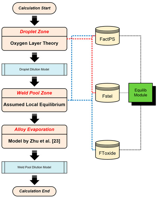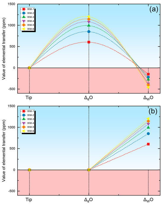 Within the framework of thermodynamic equilibrium models, emphasis is placed upon the chemical reactions occurring within the reaction zone of the weld pool (indicated through the purple dot in Figure 2) [3]. Scholars have formulated hypotheses pertaining to this interface, allowing for predictions of the transfer behaviors of elements from both the slag-metal and gas–slag-metal perspectives [3,18]. Nonetheless, a limitation of such an assessment approach emerges as it neglects the fact of O enrichment within the droplet reaction zone (see Figure 2b) and the loss of alloying elements induced by the arc plasma [1].
