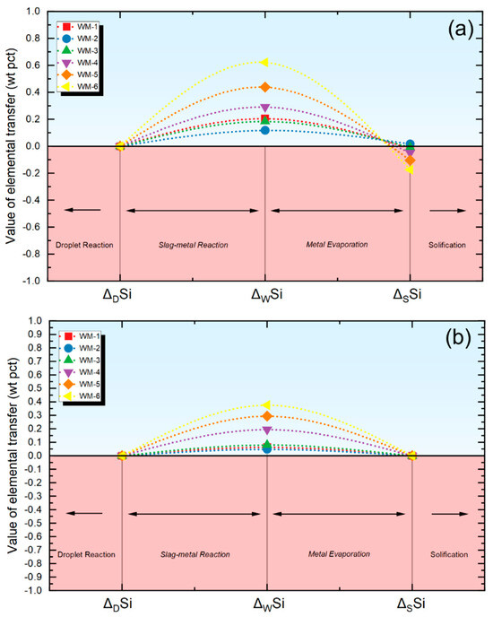 As depicted in Figure 6a, when comprehensively considering the droplet reaction zone, the molten pool zone, and the evaporation of Si, the transfer behavior of Si aligns with the actual metallurgical process of SAW [1]. Given the high content of SiO2 in the flux and its high activity, the transfer of Si to the molten pool occurs in the weld pool reaction zone, as previously described [8,14].