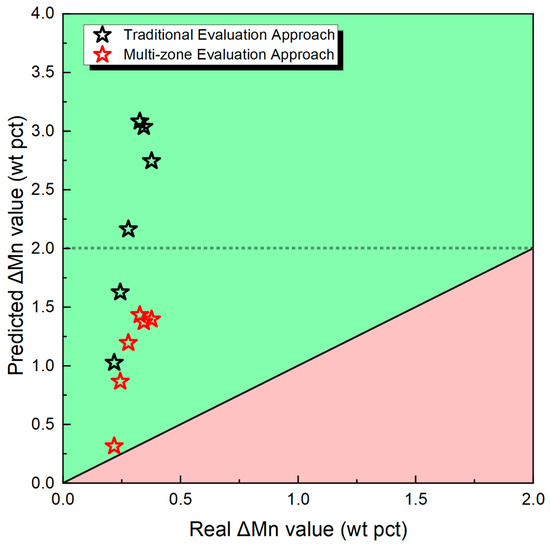 As shown through Figure 5, if the assessment of Mn’s transfer behavior is confined to the thermodynamic model within the weld pool zone, the transition of Mn appears to be solely restricted to the weld pool reaction zone, which contradicts the real metallurgical processes subject to SAW [1], as shown through the positive value in Figure 5b. Clearly, neglecting the strong oxidizing nature of the droplet and the subsequent evaporation of Mn can lead to an overestimation of the elemental transfer level of Mn [20].