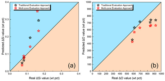 To further validate such inference, the values of ΔO and ΔSi were plotted in Figure 8. By observing Figure 8, it is evident that the use of different assessment methods does not significantly affect the overall accuracy of predictions for the total transition quantities of Si and O that are denoted as ΔO and ΔSi.