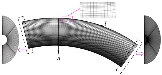 where l is the streamwise coordinate, n is the wall-normal coordinate, and R0 is the curvature radius of the concave wall. The influence range of the wall jet and droplet trajectory was considered in order to improve calculation accuracy in this study. The range of the wall-normal was n ≤ 40 mm, and the spanwise range was limited to −60 mm ≤ z ≤ 60 mm. The streamwise dimension was affected by R0, where R0 was defined as 150 mm, 200 mm, 250 mm, 300 mm, and 400 mm based on the actual dimensions of the separation equipment.