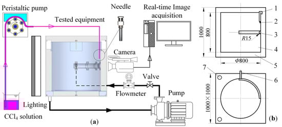 Experimental setup for a single droplet in a concave-wall jet. (a) The experimental flowchart and (b) the tested equipment: (1) support, (2) needle, (3) concave-wall jet inlet, (4) inner cylinder, (5) tank, (6) circulating water inlet, and (7) circulating water outlet. Dimensions are in mm.