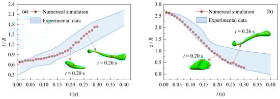 To reduce the deviation between numerical simulation and experimental results as much as possible, we used a grid division scheme with more grids and a larger computation domain. For the droplet boundary, dynamic gradient adaption approach was used to refine the boundary mesh to approximate the actual result. The consistency in the numerical simulation and experiment was verified using multiple experiments at the same time. Figure 4 establishes the experimental error bands and shows a comparison of the drop centroid position between the experimental data and simulation data. The numerical simulations performed in this paper were validated with data for which five droplets were obtained from the experiments, which proved the simulation precision using the LES-VOF model in foretelling the process of droplet deformation and breakup. The simulation result demonstrated similar trends as the experimental data concerning the relative positions of the drop centroid position and the jet inlet. All simulated data existed within the experimental data range, indicating the feasibility of using the numerical simulation scheme to describe the dynamic behavior of droplets passing through a concave-wall jet.