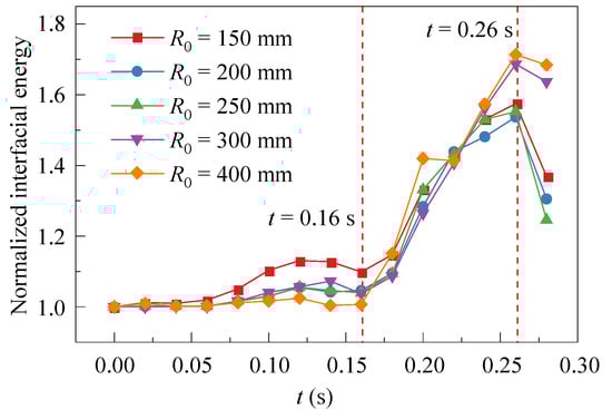 It can be seen from Figure 5 that the normalized interfacial energy was affected by the concave-wall curvature radius. The droplet fell outside of the jet at t ≤ 0.16 s, and the smaller the curvature radius of the concave wall in the free-falling stage, the larger the increment in the droplet interfacial energy and the larger the droplet deformation. At t = 0.16 s, the γ value of R0 = 400 mm decreased by 8.4% compared with that of R0 = 150 mm. After the droplet entered the jet boundary at t = 0.16~0.26 s, the interface area increased with the larger the curvature radius, and the larger the interfacial energy increment. At the moment t ≈ 0.26 s, the maximum interfacial energy was increased with R0: γmax = 1.54 when R0 = 200 mm and γmax = 1.71 when R0 = 400 mm. The result showed that a smaller R0 would still maintain a smaller interfacial energy when the droplet rushed into the concave-wall jet boundary. This explained why the hydrocyclone diameter was often designed as smaller, so the effect of the concave-wall curvature radius on a single droplet should be the basis for our investigation.