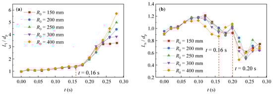 Both shear stress and normal stress are the keys to droplet breakup in turbulent flow []. When a droplet enters the jet boundary, the shear rate around the drop significantly changes. The shear rate is an important factor for droplet breakup. The concave-wall curvature radius played a crucial role in the distribution of shear stress and centrifugal force at the jet boundary, directly affecting the droplet dynamic behaviors. In our previous research [], we found that droplet extension along the streamwise direction was caused by the wall jet velocity, and the stretching along the spanwise direction was caused by a high shear rate. To gain insight into the droplet deformation properties that are affected by the centrifugal force field, we analyzed the droplet deformation dimensions along the streamwise Ll and wall-normal Ln directions. Figure 6 shows the dimensionless size analysis based on the droplet’s initial diameter dp.