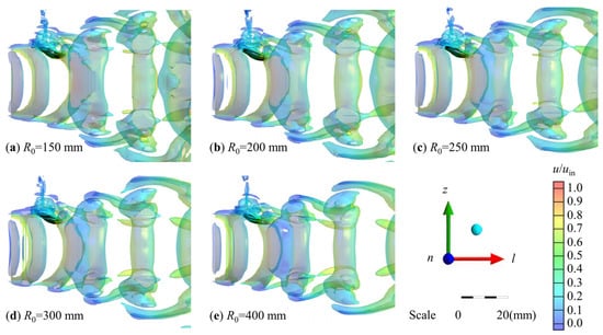 According to the Q-criterion, we can observe the vortices generated at the jet boundary. It can be seen that the continuous-phase flow field was influenced by the concave-wall curvature radius. With an increased R0, the region of Q > 53 s−2 reduced, the distance between neighboring vortices grew larger, and the influence range of the vortices became narrower along the spanwise direction. The dimensionless velocity parameter u/uin revealed that the u/uin > 0.5 regions shrank both streamwise and spanwise directions, and the continuous-phase velocity in the vortices decreased. This also indicated that the vortex strength decreased as the concave-wall curvature radius increased.
