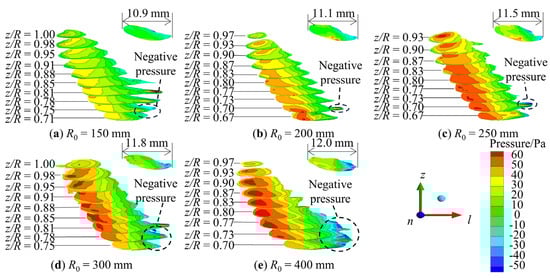 If the difference in the internal and external pressure was balanced with the interfacial tension, the droplet tended to be stable. Instead, the interphase equilibrium was destroyed, and the droplets were further deformed, causing breakup. Therefore, the pressure distribution of multiple sections along the spanwise direction was applied to study the droplet internal pressure at t = 0.20 s, as shown in Figure 8. The droplet exhibited a region (left side of the droplet) with positive pressure outside the jet and a region (right side of the droplet) with negative pressure in the jet boundary. Figure 8 shows that the volume of the negative pressure region inside the droplet increased significantly with the increase in R0. The reason is that the jet width narrowed along the wall-normal direction because the centrifugal force was strengthened when the R0 value was smaller. The streamwise size of the droplet was elongated with an increase in R0, where Ll of R0 = 400 mm rises by 10.1% more than Ll of R0 = 150 mm. Therefore, the droplet was easily broken with the larger R0 value.