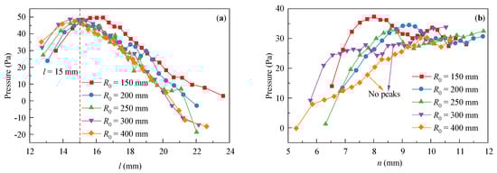 Based on the LES-VOF model simulation result, the pressure distribution inside the droplet was calculated along the streamwise and wall-normal directions. As shown in Figure 9a, the pressure distribution followed a similar trend, with the highest pressure of 50 Pa occurring at l = 15 mm. The droplet pressure near the jet inlet was lower, and the pressure increased with R0. A negative pressure region existed inside the droplet away from the jet inlet, but there was no negative pressure inside the droplet for R0 = 150 mm. As the curvature radius increased, the region and value of the negative pressure all increased. This indicates that the pressure difference inside the droplet increased, increasing the droplet length along the streamwise direction. Figure 9b reveals that the near-wall pressure of the droplet formed significant peaks when R0 = 150 mm, R0 = 200 mm, and R0 = 250 mm. When R0 = 300 mm, the droplet pressure remained essentially constant, while the pressure of R0 = 400 mm displayed a linear increase along the wall-normal direction. It was found that the pressure difference near the concave wall in the droplet decreased as the curvature radius decreased. However, the total pressure difference in the drop was lower for R0 = 150 mm and R0 = 200 mm. The droplet distance from the wall increased when reducing R0, although the centrifugal force field was enhanced near the concave wall. For the smaller R0 value, it was difficult for the droplet to break because the pressure difference inside the droplet was smaller and the distance from the wall increased.