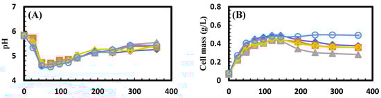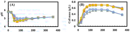 Figure 3 shows the fermentation profiles during syngas consumption in a CSL medium. The initial pH in the CSL medium for all strains was 5.8 (Figure 3A). The pH remained relatively stable until 24 h, after which strains P11, P20, and P7 exhibited a rapid decrease in pH from 5.7 to 4.6 between 48 and 96 h. Except for strain P21, the pH of the cultures with the other strains dropped below pH 5 between 48 and 144 h and was subsequently adjusted to 5.1 using 10% NH4OH. The profiles of cell mass concentration for strains P11, P7, and P20 in the CSL medium were similar (Figure 3B), with higher cell mass measured compared to strains P14 and P21 (Table 3).