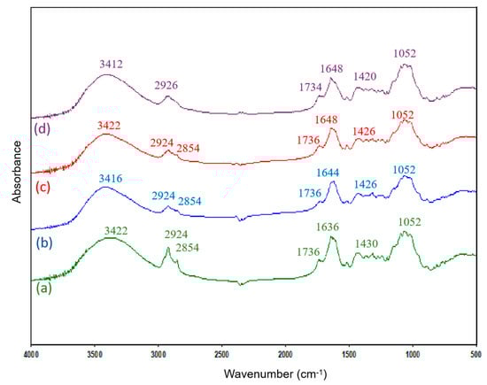 The broad peak at 3422 cm−1 can be attributed to O–H stretching vibrations of free hydroxyl groups (alcohols and phenols) and bonded OH bands of carboxylic acids present in the main components of OW (cellulose, pectin, hemicellulose, etc.) [,]. In addition, the amplitude and intensity of this peak may be related to the presence of adsorbed water molecules from atmospheric moisture [,]. To minimize this effect, the analyzed samples were dried in an oven and stored in a desiccator prior to its use. The peak at 2924 cm−1 was recognized as symmetric or asymmetric –CH stretching of the aliphatic groups, and the peak at 2853 cm−1 can be associated with symmetric stretching vibration of these groups []. The peak at 1736 cm−1 shows the stretching vibration of the C=O bond due to non-ionic carboxyl groups, and may be assigned to carboxylic acids or their esters (–COOH, –COOCH3) []. The peak around 1636 cm−1 is due to the C=C stretching that can be attributed to the presence of aromatic rings, COO- asymmetric stretching, and the bending vibration of the interlayer water molecules []. These bands can reveal the presence of pectin, hemicellulose, and lignin in the OW [].