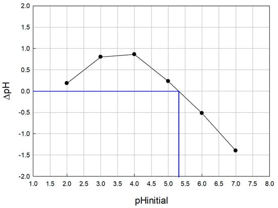 Representation for the pHpzc of OW determination (the blue line indicates pHpzc: pH at which ΔpH = 0).