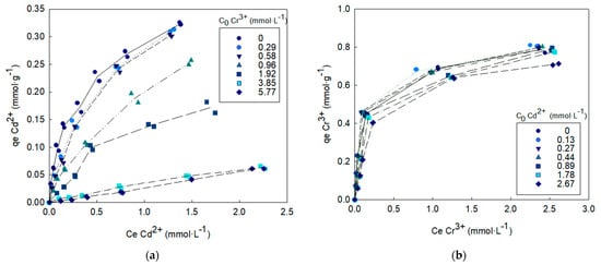 Metal A biosorption isotherm in the presence of metal B co-ions. (a) Metal A = Cd2+ and metal B = Cr3+, (b) Metal A = Cr3+ and metal B = Cd2+.