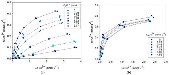 The distribution of the metal ions between the liquid phase and the sorbent, once at equilibrium, can usually be expressed by a series of isotherms. In the present work, experimental isotherms were obtained, and several models were used to describe the experimental equilibrium data (Table 1). These models have previously been used in others works to describe the equilibrium in multi-adsorbate systems [,,,,].
