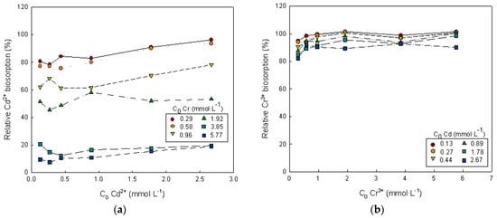 The values of relative cadmium biosorption appreciably below 100% (Figure 5) indicate that its biosorption has been significantly reduced by the presence of chromium ions in the solution. The higher the initial chromium concentration, the lower the cadmium biosorption. When the initial concentration of chromium in the solution was 5.77 mmol·L−1, the cadmium biosorption capacity was only 19% of its original value without chromium competition. The relative cadmium biosorption increased when the initial cadmium concentration, or the ratio of the cadmium concentration to total metal ions concentration, were increased. Relative chromium biosorption values close to 100% indicate that chromium biosorption was not greatly affected by the presence of cadmium ions. It can be noted that, for the highest initial cadmium concentration tested in the binary solution, the chromium biosorption capacity remained at 92% of its original capacity without cadmium competition (Figure 5).
