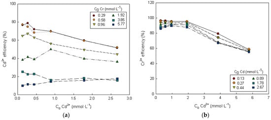Dependence of the biosorption efficiency of metal i on the initial concentrations of metals i and k. (a) Metal i = Cd2+ and metal k = Cr3+, (b) metal i = Cr3+ and metal k = Cd2+.