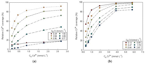 For each metal in the binary solution, the relative coverage of a metal (metal i) increases as its initial concentration increases and as the concentration of the other metal in solution (metal k) decreases. The relative coverage of cadmium is more influenced by the presence of chromium than vice versa (Figure 7). The same results were observed for the binary system Zn2+-Cr3+ (Supplementary Material: Figure S2).