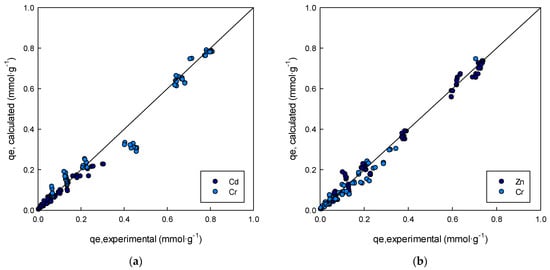 Relationship between the experimental sorption capacity data and sorption capacity data provided by the extended Sips model (a) Cd-Cr system, (b) Zn-Cr system.