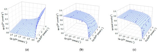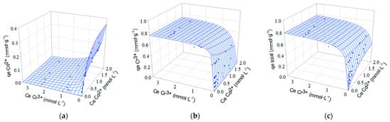 One of the most common ways of presenting equilibrium data in biadsorbate systems is through three-dimensional (3D) graphs. These plots are obtained by plotting the adsorption capacity of one adsorbate or the total adsorption capacity against the concentrations of the adsorbates in the solution, once equilibrium has been reached. Therefore, for a biadsorbate system, three plots are obtained, one for the adsorption capacity of each adsorbate and a third one for the total adsorption capacity. In each plot, the adsorption isotherm is represented by a surface. Figure 9 and Figure 10 show, for each of the biadsorbate systems, the experimental equilibrium data (points) together with the adsorption isotherms obtained with the extended Sips model (surfaces), which is the one that best describes the equilibrium data. The competition between metals for adsorption sites and the selectivity of the biosorbent for these metals can be assessed by examining Figure 9 and Figure 10.