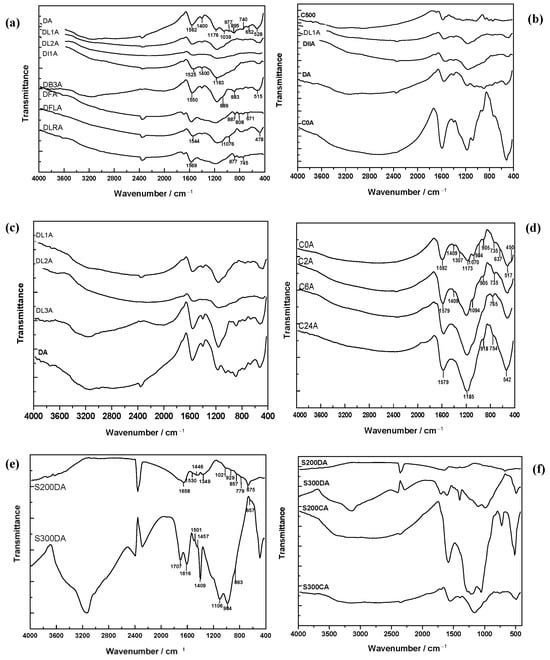 FTIR spectra for the different series of samples, grouped by: (a) impregnation with diluted phosphoric acid; (b) single impregnation procedure; (c) multiple impregnation procedure; (d) impregnation with concentrated phosphoric acid; (e) impregnation with diluted phosphoric acid (semi-carbonized feedstock); (f) impregnation with either diluted or concentrated phosphoric acid (semi-carbonized feedstock).