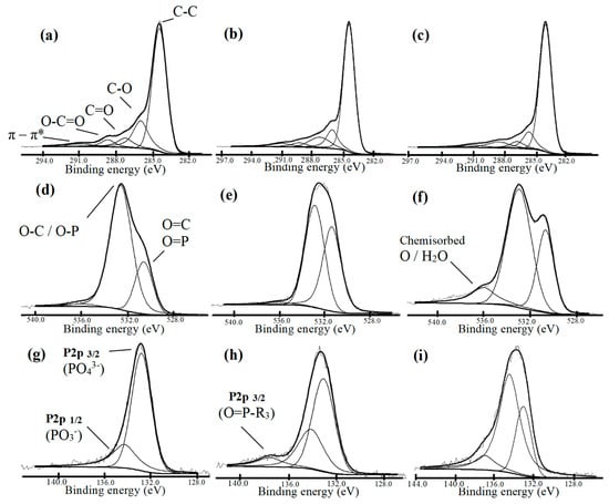 X-ray photoelectron spectroscopy (XPS) measurements were carried out using K-Alpha Thermo Scientific (Waltham, MA, USA) equipment under high vacuum conditions (2 × 10−7 mbar). A monochromatic radiation of 1486.68 eV (Al Kα line) was used to irradiate samples perpendicularly at 12 kV. Additionally, a flood gun device (working at 4.2 mA) compensated for the load losses. The register settings were established as 50 ms accumulation time for each step in all cases. Survey spectra were recorded by 1 eV energy steps and 20 scans, while 0.1 eV steps were taken for specific regions (30 scans in C1s and 40 scans in O1s and P2p). The obtained spectra were calibrated in the C1s region by taking the C-C contribution as 284.4 eV []. The numerical treatment was performed with the XPSpeak 4.1 software tool, and the background corrections effected with Shirley functions. The deconvoluted spectra for each specific region (C1s, O1s and P2p) were obtained after imposing several constraints, in order to maximize the quality of the fitting. These constraints were mainly those concerning the peak full width at half maximum (FWHM), which was restricted to the 1.3–2.5 eV range, and the Gaussian-to-Lorentzian ratio, which was forced to be in the range of 75–90% in C1s contributions, except for the C-C band at ~284.4 eV. Asymmetry corrections were not applied.