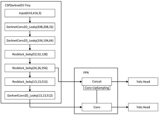 Compared with SSD, other series of YOLO, and other series of one-stage detection algorithms, YOLOv4-tiny is a lightweight version of YOLOV4, with fewer layers and a faster detection speed. It can be used in portable devices, requires less GPU resources for training, and has a low memory load, which can be widely used in industrial sites. Therefore, this study adopts the YOLOv4-tiny architecture, and its core architecture can be seen in Figure 2, which is divided into two parts: CSPdark-net53_tiny and FPN. CSPdarknet53_tiny classifies and predicts image candidate boxes and FPN performs feature extraction of different sizes to see whether the network contains the target feature.
