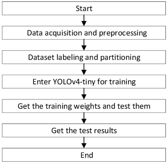 Firstly, the YOLOv4-tiny [34] algorithm process needs to collect and preprocess the data. Secondly, all images are labeled with labels for training and testing. Finally, the training results are applied after obtaining the training results. The algorithm flow chart is shown in Figure 3 below.