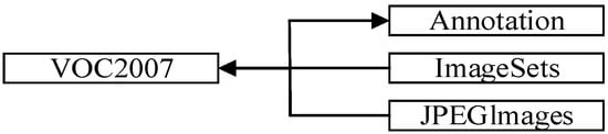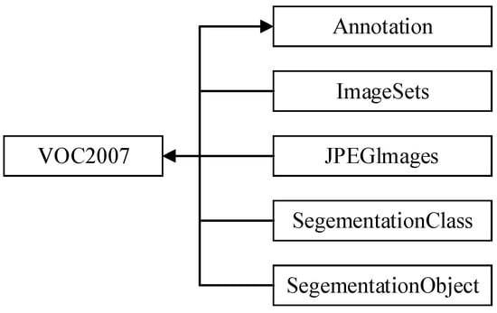 In this study, the official VOC2007 dataset (the open dataset can be seen at http://host.robots.ox.ac.uk/pascal/VOC/voc2007/, accessed on 10 June 2023) was selected for pre-run. So, when making the dataset, the dataset was also organized in the VOC format to ensure its correctness. The VOC format is shown in Figure 4.