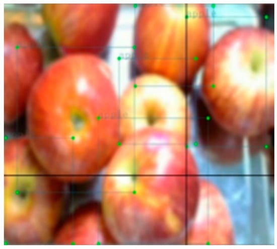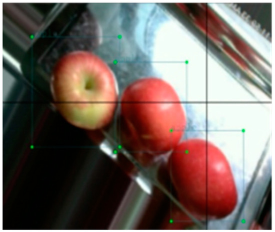 In this study, Labellmg (a powerful visual graphic identification application) is used for the manual annotation of the VOC label format, as shown in Figure 15. First, a rectangular box is drawn with the mouse on the collected picture to indicate the exact location of the fruit in that picture. The size of this rectangular box should be as close as possible to the size of the fruit, and if the occlusion rate of the fruit exceeds 70%, it should be avoided. In addition, if the fruit is at the edge of the image and the exposed area is less than 50%, it should also be avoided. When a series of fruits are labeled, Labellmg will automatically generate an XML label file. The <filename> of the image is recorded in the label in the XML file generated through manual annotation. <size> labels record overall information about the length, width, and number of channels of the image. Each <Object> label records the target information for each fruit in the picture, and its sublabel <name> records category information. The sublabel <bndbox> records the bounding box information and the target position information, including the coordinates of the upper-left and lower-right corners of the rectangular callout box. The file code is shown in the Supplementary Materials.