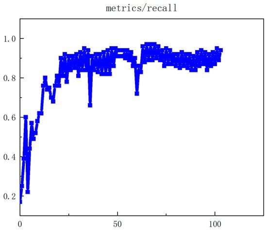 With regard to recall analysis, the image recall is shown in Figure 26. The recall rate reflects the proportion of all true targets that the model accurately predicts the correct target. The higher the value, the better; one is ideal. As shown in Figure 26, as the number of training rounds increases, the recall climbs first, tends to level off at about 80 rounds, and finally is 95.47%. This also shows that the training results are better.