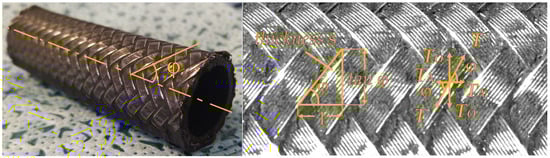 The angle of the hydraulic hose braid has a major influence on the hydraulic hose deformation and the forces acting on the hose ends [,,,]. When the hose is loaded by fluid pressure, the hose steel braid tends to deform so that the opposing strands of the braid are at a neutral braid angle to each other at which the axial and hoop stress components are in balance. This deformation causes relative friction between the steel braid and the rubber tube or rubber interlayer of the hose. The degree of deformation of a hydraulic hose influences its service life []. The solution to this problem is the method of braiding the steel wires at a neutral braid angle φN = 54.7356° to the hose axis. In this case, the balance between axial and hoop stresses is ensured. When manufacturing hydraulic hoses, the aim is to maintain the required braid angle. This is ensured by the right combination of the braiding rate and feed rate of the manufacturing machine [].