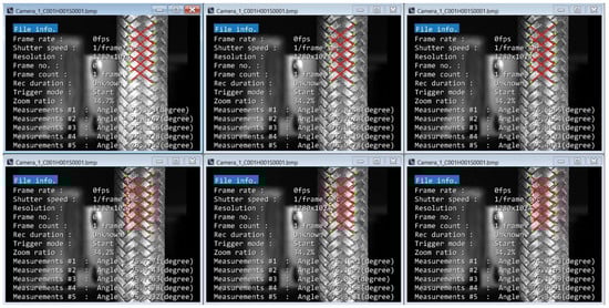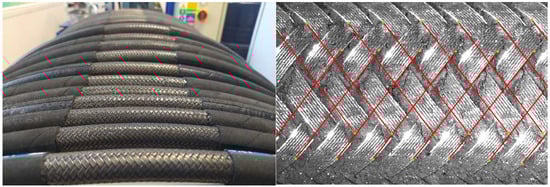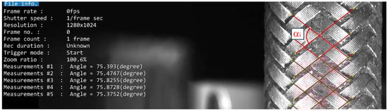 In both experiments, the braid angle of the tested hydraulic hose was simultaneously evaluated for working pressure pmin = 0 bar a pmax = 140 bar. Figure 6 shows the method for the evaluation of the hydraulic hose braid angle. The evaluation of the braid angle was performed using Photron FASTCAM Viewer 4 (PFV4) software. Due to the optical distortion of the angle, the braid wires that crossed relative to each other in the center of the hydraulic hose were evaluated. This was the point where the least optical distortion occurred, which is due to the curvature of the hydraulic hose. Subsequently, the angle αi was evaluated by using the function “angle 2” with two plotted lines parallel to the braid of the hose. Subsequently, the angle of the braid φi with respect to the longitudinal axis of the hydraulic hose was determined using Equation (12):