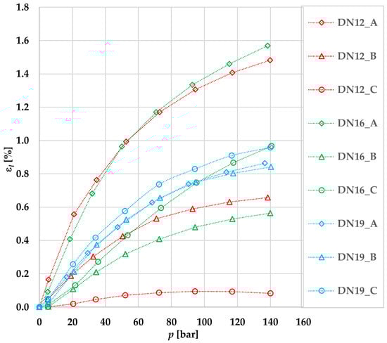 A summary graph of all hydraulic hoses for the experiment εl = f (p) can be seen in Figure 8. For evaluating the results, it is important to consider several factors that may affect the individual dependencies. Both the initial braid angle φin and the actual change in the braid angle Δφ must be considered. Based on the theory presented in Section 2, the greater the difference between the initial φin braid angle and the neutral angle, the greater the potential for geometric change in the hose. While increasing the working pressure p, the braid angle changes from φin to φen. The greater the change in the braid angle Δφ during the increase in working pressure p, the greater the length strain εl will be. The initial braid angle φin was measured to be less than the neutral braid angle φN for all tested hoses. For all hoses tested, the initial braid angle φin was determined to be less than the neutral angle. It can therefore be assumed that all of the hoses tested will experience a length shortening. Other important aspects to be considered in the evaluation are the inner diameter din and the wall thickness s of the hose. When the working pressure p is applied to two hydraulic hoses with the same inner diameter din but different thickness s, it can be assumed that the hose with the smaller thickness s should achieve a greater length strain εl due to the bottom passive resistance due to the deformation of the hose wall. The next aspect that could affect the results is the length of the hose. There is a small difference in the length between the measured hoses, so the hose length change Δl was expressed as a percentage: