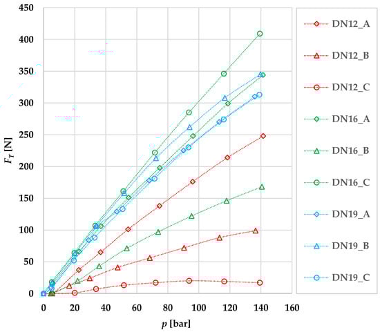 Dependence of tensile force FT on the working pressure p for all measured hoses.