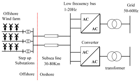 The application of low-frequency AC (LFAC) systems has been suggested as an attractive solution to both HVAC and HVDC [7,8,9,10,11]. LFAC was originally introduced to the railway industry a century ago. Later, it was applied to OWPPs, as it allows for greater cost savings because of the increased maximum transferable active power compared to HVAC. Additionally, it eliminates the need for a converter at the offshore substation, which is required in the case of HVDC transmission systems. A typical LFAC OWPP is shown in Figure 1, which is composed of an offshore substation, a submarine cable, and an onshore substation. The OWPP operates in low-frequency ratios around 1–20 Hz to maximize power transference. Then, voltage source converters, usually MMCCs, are used in the onshore substation to connect the low-frequency to the 50 or 60 Hz grid.