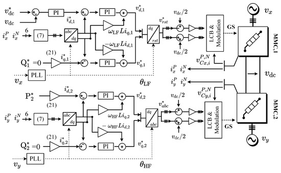 It is important to note that in the B2B configuration, an MMC regulates through the direct component of the LF port current . Moreover, the inner current loops, based on PI control, regulate the aforementioned currents to their respective references, which are defined for the active and reactive power at the LF and HF ports as follows: