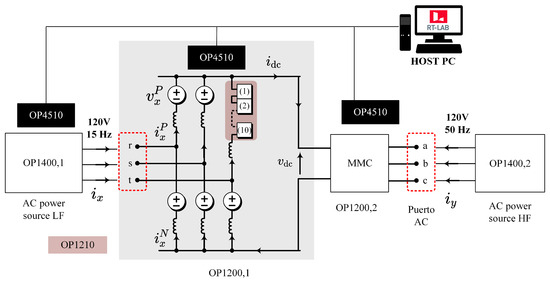 Each MMC OP1200 incorporates 60 full-bridge power cells. The control platform comprises a master and two slave Real-Time Simulators (RTSs) from OPAL-RT, model OP4510. The OP4510 is used as control stages to program the control strategy described in Figure 3 and Figure 4. The master RTS is connected to a host computer and configured to send the references to the slave RTS and regulate both MMCs. The master RTS receives the measurements of the electrical variables and provides a real-time visualization of these variables. The host computer runs the control strategy over RT-LAb and Simulink; then, all measurements can be accessed in real time and are plotted using Matlab figures. A third RTS is also used to control programmable AC power sources. The first MMC performs the Q control, and the second MMC performs the PQ control. Programmable AC power sources operate at 120 V/15 Hz in the LF port and 120 V/50 Hz in the HF port.