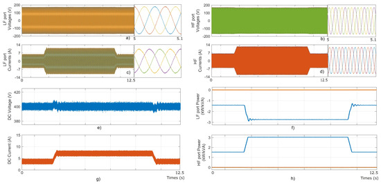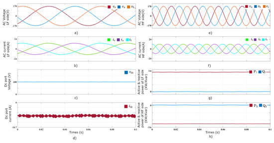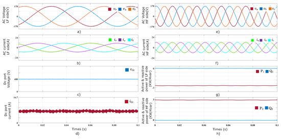 voltages. (d) HF port currents. (e) DC port voltage. (f) Active and reactive power, LF port. (g) DC