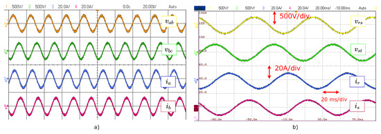 Experimental results for a3 kW power transfer between the LF port and the HF port. The results are presented in Figure 7, Figure 8 and Figure 9. It is important to note that all waveforms are plotted within a time window of 0.1 s. AC voltages and currents on the LF side can be observed in Figure 7a and Figure 7b, respectively. As illustrated in Figure 7c,d, the DC voltage and current are regulated at 400 V and 7.5 A, respectively. Furthermore, both MMCs exhibit appropriate power tracking for active and reactive power as shown in Figure 7d,e.